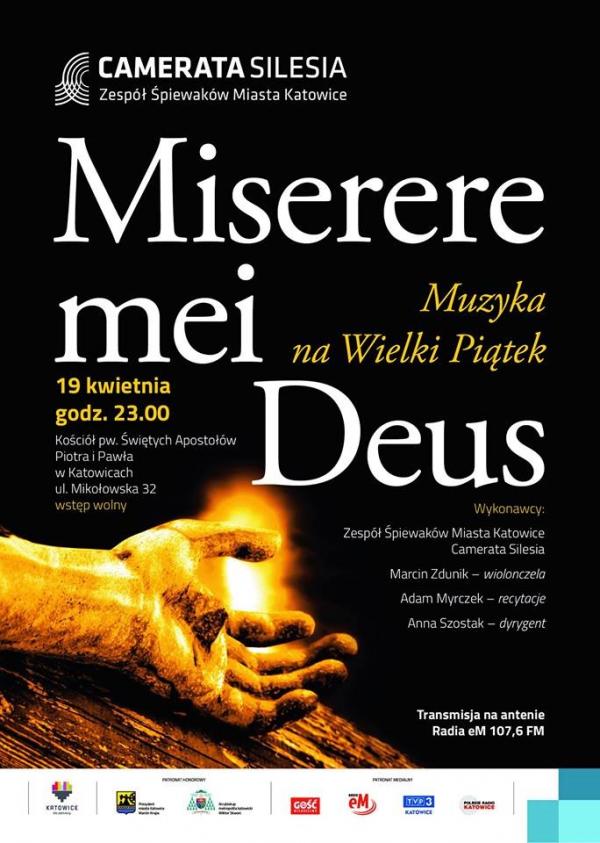 Jest już tradycją, że w Wielki Piątek późnym wieczorem Zespół Śpiewaków Miasta Katowice "Camerata Silesia" wykonuje w katowickim kościele świętych Piotra i Pawła najpiękniejsze utwory pasyjne, ze zjawiskowym 9-głosowym "Miserere mei, Deus" Gregorio Allegriego na czele. W tym roku obok Zespołu wystąpi także wiolonczelista Marcin Zdunik, stąd też w programie znalazła się także m. in. kompozycja Pawła Łukaszewskiego "Siedem ostatnich słów Chrystusa na Krzyżu" oraz przejmujące „Svyatyi” Johna Tavenera, w których przewidziano solowe partie wiolonczeli. Muzyka przeplatana będzie recytacjami w wykonaniu Adama Myrczka.