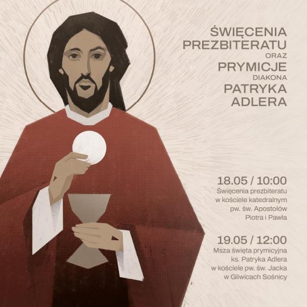 Już w najbliższym tygodniu, w wigilię uroczystości Zesłania Ducha Świętego, w sobotę 18 maja o godz. 10:00, w naszej katedrze gliwickiej zostanie wyświęcony na prezbitera syn naszego Kościoła lokalnego, diakon Patryk Adler, pochodzący z parafii św. Jacka w Gliwicach Sośnicy. Jako kapłan zostanie posłany przez Boga do Kościoła, aby głosić słowo nadziei i sprawować sakramenty, zwłaszcza Eucharystię, dla budowania wspólnoty wiary, nadziei i miłości.