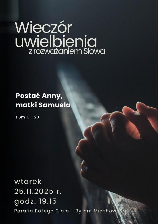 Serdecznie zapraszamy na ostatnie w tym miesiącu spotkanie w ramach cyklu o Kościele "Aby stanowili jedno" - wieczór uwielbienia. Tym razem przyjrzymy się postaci Anny, matki Samuela.
