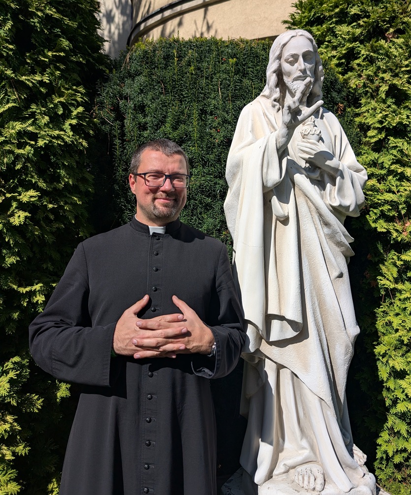 Urodził się 8 października 1986 r. w Zabrzu, skąd pochodzi - jego rodzinna parafia to parafia św. Franciszka z Asyżu w Zabrzu Zaborzu. Ukończył Publiczne Liceum Ogólnokształcące Towarzystwa Salezjańskiego im. św. Dominika Savio w Zabrzu, a po maturze kontynuował naukę w Wyższym Międzydiecezjalnym Seminarium Duchownym w Opolu. Po odbyciu praktyki diakońskiej w parafii Matki Bożej Matki Kościoła w Zabrzu Helence 11 czerwca 2011 r. przyjął w katedrze gliwickiej święcenia prezbiteratu przez posługę biskupa Jana Wieczorka. W latach 2011 - 2018 był wikariuszem parafii św. Katarzyny Aleksandryjskiej w Toszku, następnie w latach 2018 - 2022 w parafii Chrystusa Króla w Gliwicach oraz ostatnio (2022 - 2025) w parafii św. Anny w Gliwicach Łabędach. Od 29 sierpnia 2025 r. pełni posługę w naszej wspólnocie, gdzie katechizuje w Szkole Podstawowej Nr 26, jest opiekunem Dzieci Maryi, grupy GROM, Domowego Kościoła oraz odpowiada za przygotowanie dzieci do Pierwszej Komunii.
